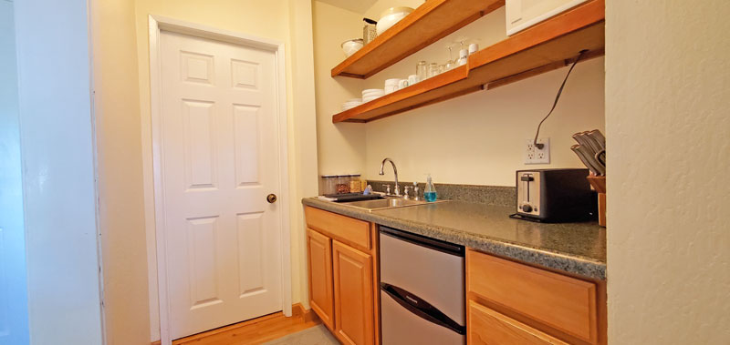 - Kitchenette with small refrigerator, toaster, coffee maker, rice cooker, dishes, utensils