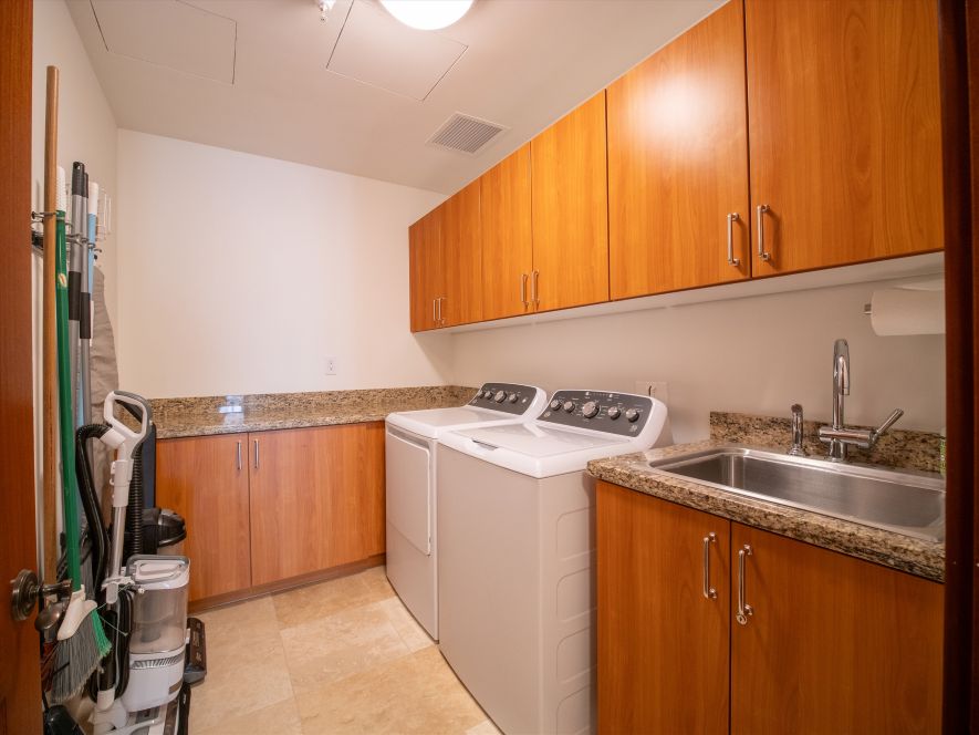 - Full-size washer/dryer, iron & board